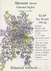 The Alyssum Sweet Oriental Nights, 'Lobularia maritima', displays tiny, rich, solid, deep purple flowers that make this low ground cover a delight. It is a wonderful annual ground cover. The Alyssum blooms all growing season. Nothing adds more to summer days than the frangrance of sweet Alyssum. The flowers are very small at 1/4 inch deep purple blooms that appear in clusters. This plant is excellent in rock gardens, in hanging baskets, in the foreground of borders, and as a ground cover.