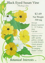 The Black Eyed Susan Vine, 'Thunbergia alata', is a vigorous vine with spunky yellow, orange, and white flowers. The solid black eye of the flowers contrast vividly with petal colors. The Black Eyed Susan vine is easy to grow and produces flowers that are 1 to 2 inches wide. This vine blooms reliably from early summer through late summer. The Black Eyed Susan vine can be grown as a quick screen and as a colorful groundcover. They are excellent in window boxes and hanging baskets.