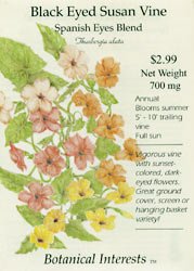 The Black Eyed Susan Vine (Spanish Eyes Blend), 'Thunbergia alata', is a vigorous vine with sunset colored, dark eyed flowers. The Spanish Eyes Blend is a very fast growing vine with a unique blend of warm colors which contrast brilliantly with the dark "Spanish" eyes. The flowers are between 1 and 2 inches wide on a 5 to 10 foot vine. The Black Eyed Susan vine can be grown as a quick screen and as a colorful groundcover. They are excellent in window boxes and hanging baskets.