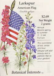 The Larkspur American Flag, 'Consolida ambigua', has vivid blends of red, white, and blue. The Larkspur will add beauty and a patriotic flair to your garden. In most areas, this Larkspur Blend will bloom around Flag Day. The red, white and blue 1/4 to 1/2 inch flowers are densely packed on tall stems. The American Flag Larkspur blooms in mid spring to early summer. Larkspur are excellent for cut or dried flowers and as backdrop plant in front of a fence or wall.