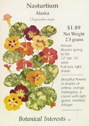 The Nasturtium Alaska, 'Tropaeolum minus', has beautiful flowers in shades of yellow, orange, mahogany, and cream with light green, marbled foliage. Every salad should have edible Nasturtium and Viola flowers in it! Nasturtium leaves are edible. Nasturtiums perform well in bad soil, but are comfortable in average garden soil that is not overly fertile. Nasturtiums are used for edging and borders and can be grown inside. These plants will also deter whiteflies, squash bug, and rabbits.