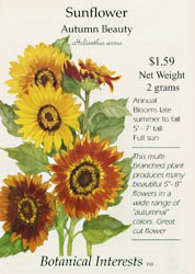 The Sunflower Autumn Beauty, 'Helianthus annuus, is a multi-branched plant that produces many beautiful 5 to 8 inch flowers in a wide range of "autumnal" colors. It also makes a great cut flower. Autumn Beautys bloom over an extended period of time. This is a sunflower that will turn heads. After the initial spring planting, plant another crop in month. This will ensure a continual supply of flowers until late fall. They are drought tolerant, but they will take considerable moisture for full flowering.