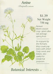 The Anise, 'Pimpinella anisum', was so enjoyed by the Romans, they could pay taxes with anise. The seeds and leaves are tasty and they are also useful for medicinal purposes. Anise seed has a sweet, licorice flavor and is used to intensify sweetness in cakes, pastries, and cookies. Also, either alone or combined with cinnamon or bay, compliments duck, pork, or fish. Anise prefers a protected spot because it grows spindly and is easily damaged by wind. The soil should be fairly rich and well drained.