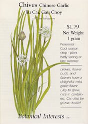 The Chives Chinese Garlic, Jiu, Cai, Gau Choy, 'Allium tuberosum', has leaves, flower buds, and flowers that have a delightful mild garlic flavor. They can be grown in containers and also can be grown inside. When young, the Chinese Garlic Chives' leaves and flower buds, have an oniony, honey-like, garlic flavor. Chinese Garlic Chive plants are 18 inches tall have flat leaves, 1/4 inch wide, and 10 to 18 inches long. Plant in the early spring as soon as the soil can be worked or 2 months before first fall frost. Chives prefer rich, well drained soil.