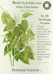 The Bean Bush Baby Lima White Dixie Butter, 'Phaseolus lunatus', has white, small "baby" lima beans that have a delicious flavor and mature earlier than most limas. Fresh lima beans taste so different than store bought beans that you won't recognize them. The White Dixie Butter is sweet, tender and nutty. This bush lima ends up loaded with pods. Lima beans prefer deep, sandy and well drained soils. Pick the pods when they are bulging but before they begin to turn yellow and dry out.