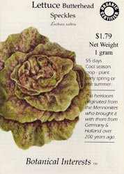 The Lettuce Butterhead Speckles, 'Lactuca sativa', is an Heirloom that originated from the Mennonites who brought it with them from Germany and Holland over 200 years ago. Make a salad with Speckles lettuce and no one will notice if there are bugs in it. The unusual speckling of these mild, tender, thick but soft leaves will add visual interest to any salad. Speckles is rarely bitter and is quick maturing. They will grow in light shade. Lettuce grows well near cabbage, beets, carrots, chives, garlic, and onion.