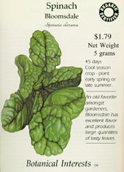 The Spinach Bloomsdale, 'Spinacia oleracea', is an old favorite amongst gardeners. The Bloomsdale has excellent flavor and produces large quantities of tasty leaves. If you are new to gardening, try fresh spinach in the garden, the buttery flavor will win you over. Spinach is also very nutritious with lots of Vitamin A, C, and iron and is low in calories. Harvest individual leaves from outer edges as they become big enough to use or cut the whole plant 1 inch above the base and new leaves will grow.