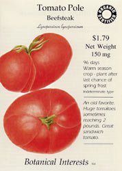 The Tomato Pole Beefsteak, 'Lycopersicon lycopersicum', is an old favorite. The huge tomatoes can reach up to 2 pounds. This old favorite is for those who love meaty, thick, tasty, large tomatoes for sandwiches. They are also useful for almost any dish that would benefit from rich tomato flavor. The vines are so vigorous that we recommend wire cages to hold up the plants and tomatoes. Tomatoes need at least 1 inch of water a week. Soak to depth of 6 to 10 inches when watering. They need at least 6 hours of direct sunlight a day.