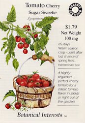 The Tomato Cherry Sugar Sweetie, 'Lycopersicon lycopersicum', is a highly regarded, perfect cherry tomato for classic tomato flavor in salads or right out of the garden. This delicious organic tomato is well known for it's strong tomato flavor. The Sugar Sweetie has large numbers of 3/4 to 1 inch cherry tomatoes that are produced in grape-like clusters on 2 foot tall plants. Tomatoes need at least 1 inch of water a week. Soak to depth of 6 to 10 inches when watering. They need at least 6 hours of direct sunlight a day.
