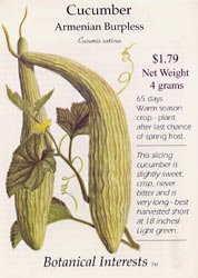 The Cucumber Armenian Burpless, 'Cucumis satiovus', is a slicing cucumber that is slightly sweet, crisp, and never bitter. The Armenian Burpless is very long and is best harvested short at 18 inches. Want to try something new in your garden? This is the variety. It has excellent flavor and absolutely gorgeous light green, thin skin. Cucumbers have a shallow root system and therefore require regular moisture. Do not let cucumbers get too big because the vines stop producing if over mature cucumbers stay on the vine.