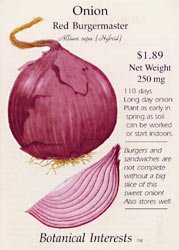 The Onion Red Burgermaster, 'Allium cepa (Hybrid)', has a sweet taste that make burgers and sandwiches complete when they have a slice of this onion. The Red Burgermaster has bright red, globe shaped onions with very attractive, crisp red and white flesh. They are also great in salads and thousands of other dishes where sweet, mild onions are a must. It is very important to keep onions weeded. Note: If the bulb pushes itself out of the ground, cover it with mulch or straw, not soil.