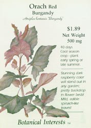 The Orach Red Burgandy, 'Atriplex hortensis 'Burgandy', a stunning dark raspberry color that will stand out in any garden. The Burgandy Orach makes a pretty backdrop in flower beds and it has the mild, edible spinach-like leaves. Orach is an old kitchen garden vegetable grown by American settlers, deserves more attention. It has a mild flavor that does not get bitter when the plant bolts. The best and most tender leaves are the ones from the top of the plant and/or from young plants.