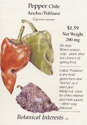 The Pepper Chile Ancho/Poblano, 'Capsicum annuum', is called "Pablano" in the fresh green form and "Ancho" as a dried pod. This Chile Pepper is mildly hot and is used for chilies rellenos and mole sauces. The Poblano is one of the most popular chilies in Mexico. The green Pablano is stuffed with cheese or meat for chilies rellenos and the dark, reddish-brown dried Ancho is used in a variety of sauces such as the traditional "mole pablano". Harvest when 3.5 inches long and 2 inches wide and when the peppers are a dark green.
