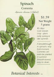 The Spinach Correnta, 'Spinacia oleracea (Hybrid)', is a breakthrough spinach plant. It is very bolt-resistant and it can even be planted in the summer. Correnta is very smooth leaved and easy to clean. Spinach is very nutritious with lots of Vitamin A, C, and iron. It is very low in calories. Correnta has round, heavy, smooth, and tender leaves. It is also a great container plant. Harvest individual leaves from outer edges as they become big enough to use or cut the whole plant 1 inch above the base and new leaves will grow.