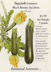 The Squash Summer Black Beauty Zucchini, 'Cucurbita pepo', has very tender, creamy white, flavorful flesh. The Black Beauty Zucchini plant is compact and bush like. This squash is a very versatile vegetable. They can be steamed, grilled, sauteed, eaten raw in salads, made into relish, and made into breads. Harvest as soon as squash reaches at least 1 inch in length and up to 6 inches in length. Squash are most tender and flavorful when young.