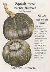 The Squash Winter Burgess Buttercup, 'Cucurbita maxima', is arguably the best tasting and best flavored winter squash. The Burgess Buttercup Squash has very sweet, stringless, and fiberless flesh. Being a winter squash, it will store for several months. The 6 foot vines have flattened turban-shaped squash that are 5 to 8 inches in diameter and about 4 pounds in weight. They should be harvested when you can't dent the hard skin with your finger. Winter squash cannot be overripe, but can be under ripe.