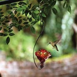 This unique blossom is crafted of recycled glass in a stunning flame red color. As attractive to you as it is to the hummingbirds. We've gathered absolutely everything you need: heavy glass feeder, hanging hook, cleaning brush, nectar, and instructions. Nicely boxed for wrapping.